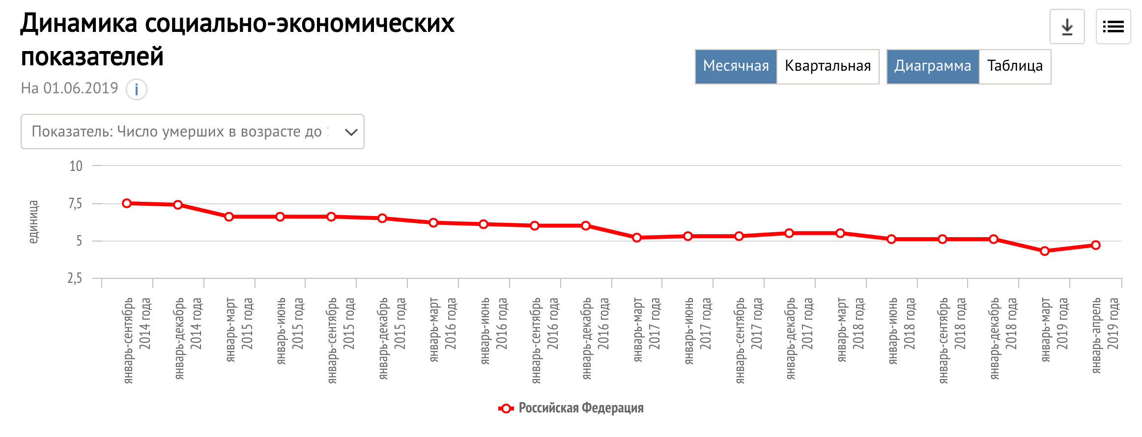 В России также понимают важность этого показателя: снижение его уровня заложено в "Национальной стратегии действий в интересах детей на 2012-2017 годы". Чтобы понять, удалось ли достичь этой цели, обратимся к сайту iminfin.ru, который содержит оперативные данные Федеральной службы государственной статистики по этому направлению. С 2013 года по апрель 2019 года младенческая смертность по Российской Федерации уменьшилась на 43,4% и составляет 4,7 единиц на 1000 рожденных.