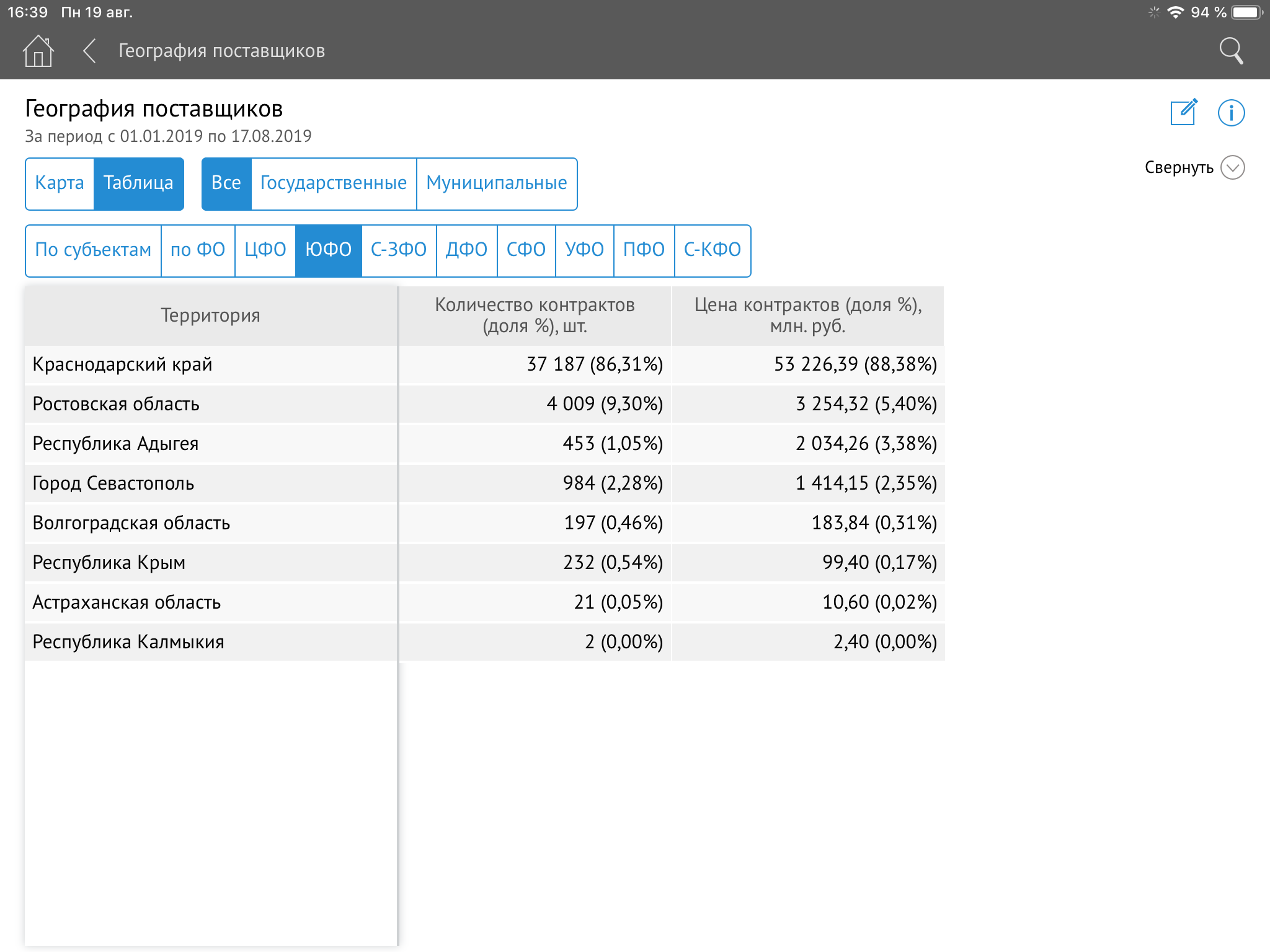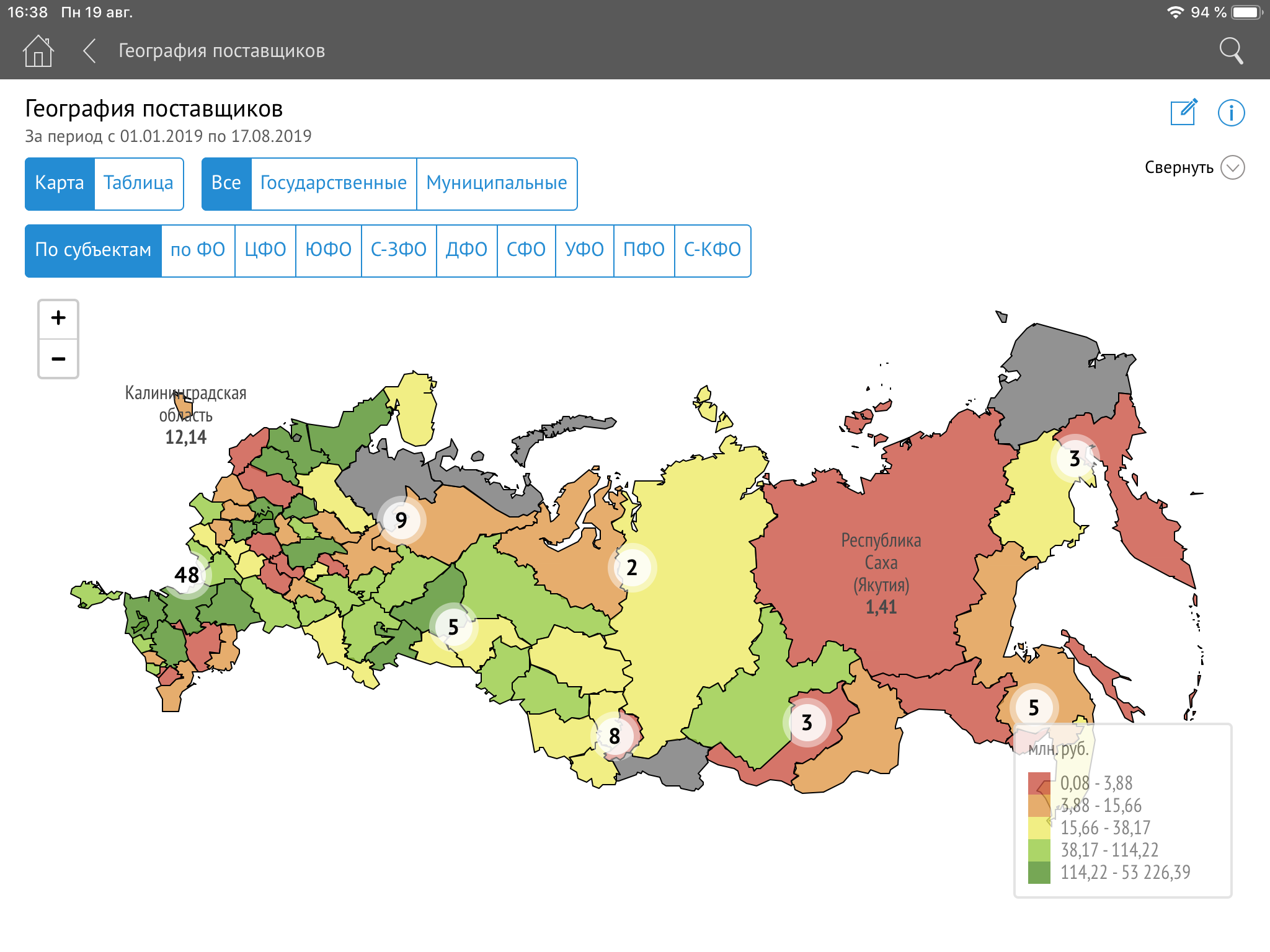 Информация нового отчета представлена на карте РФ, картах федеральных округов с указанием количества и сумм контрактов, заключенных с исполнителями из разных субъектов РФ, а также в табличном виде. В табличном представлении указывается доля по количеству и суммам заключенных контрактов.