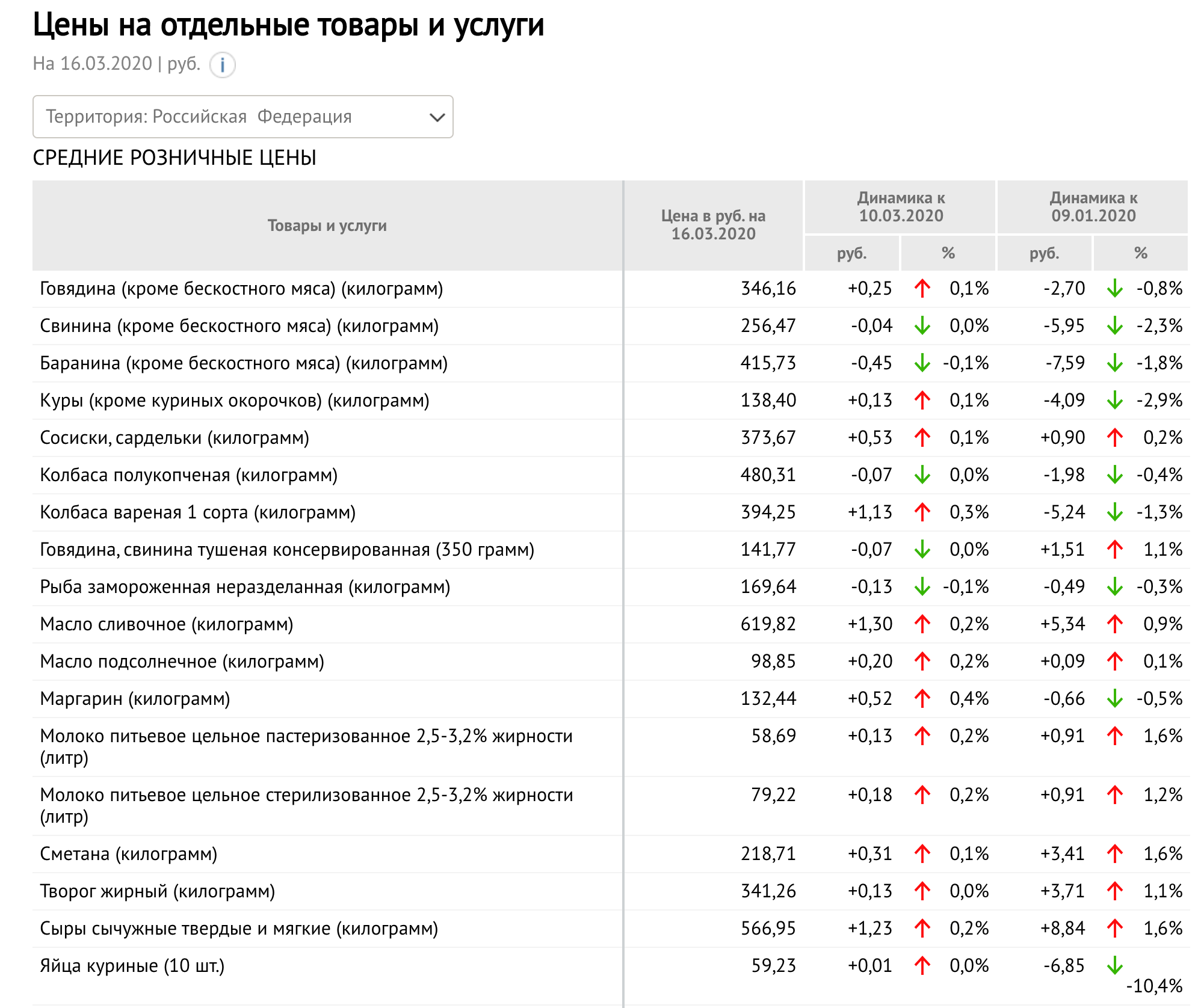 Узнаем, как отразился рост спроса на товары первой необходимости на ценах на них, обратившись к данным iminfin.ru. По данным на 16 марта цена на гречку по стране поднялась за неделю на 16 копеек или 0,2%, а с начала года - на 1,28 рубля или 2%. Цены на макароны также росли: за неделю на 12 копеек или 0,2%, а с начала года - 1,1 рубля или на 1,5%. Несмотря на наблюдаемый рост спроса на крупы, цены на рис и пшено, напротив, снижались, как с начала года (на 1,2% и 2,4% соответственно), так и за прошедшую неделю (на 0,1% и 0,6%). Cахар по сравнению с началом года подешевел (на 1,1%), но стал дорожать с 10 марта (на 0,5 копеек или 1,6%). На консервированную говядину/свинину, напротив, за этот период было зафиксировано снижение цены (на 7 копеек), притом что с начала года цена выросла на 1,5 рубля. Рост цен хозяйственное мыло наблюдался в течение года (за год они выросли на 51 копейку, а за неделю - на 2).
