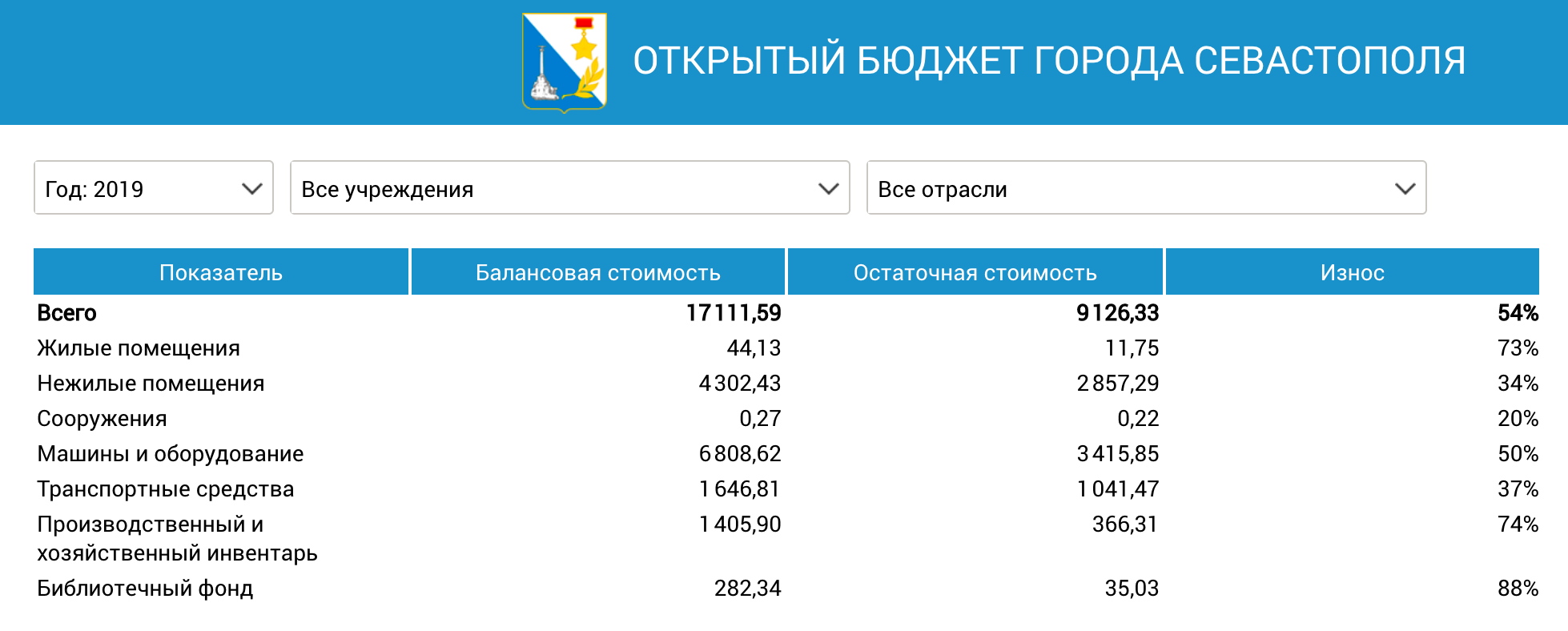 Балансовая стоимость имущества госучреждений на начало 2020 года составляла 17 111,59 млн руб. В составе имущества преобладали машины и оборудование, стоимость которых составила 6 808,62 млн руб. (40% стоимости всего имущества). Степень износа фондов составляет 54 процента. Самую большую изношенность имеет библиотечный фонд (88%) , наименьшую - сооружения (20%).