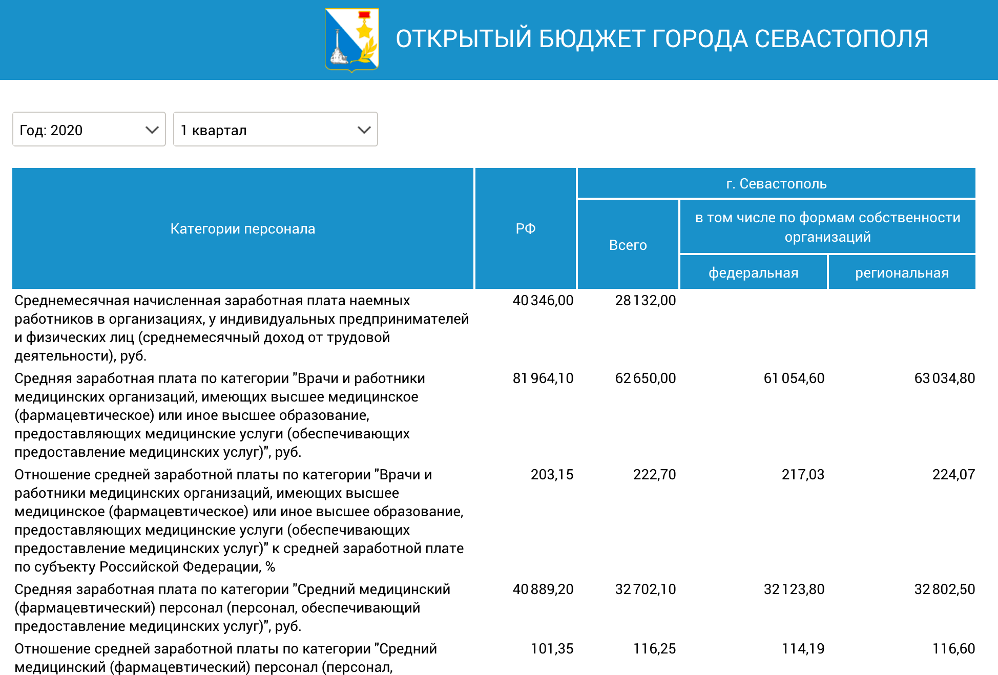 Среднемесячная начисленная заработная плата работников бюджетной сферы г. Севастополя по данным на 1 апреля 2020 года была на уровне 28 132,00 руб. Это было на 30% или 12 214,00 руб. ниже, чем в среднем по стране. Больше всего в 1 квартале 2020 года в государственных (муниципальных) учреждениях г. Севастополя зарабатывали преподаватели учреждений высшего профессионального образования (65 025,50 руб.), а меньше всего - младший медицинский персонал (29 474,80 руб.) Эти показатели также были ниже среднероссийского уровня на 26% и 19% соответственно.
