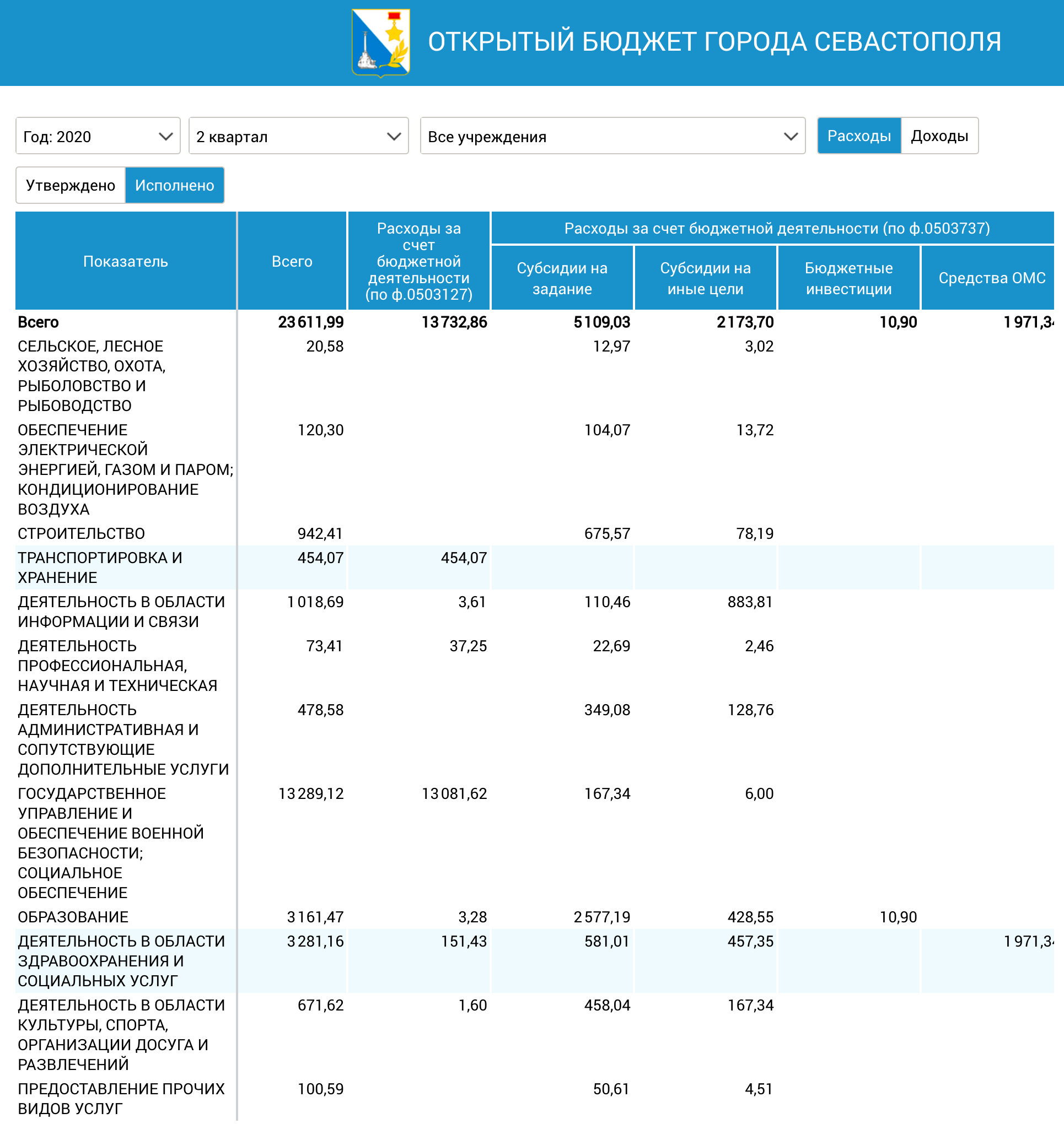 Выплаты учреждениям за два квартала 2020 года достигли 23 611,99 млн руб., план по расходам был выполнен на 70,8%. Почти полностью (97,4% всех расходов) это были расходы за счет бюджетной деятельности (22 997,83 млн руб.). Расходы за счет приносящей доход деятельности составляли всего 2,6% от общего числа или 614,16 млн руб.
