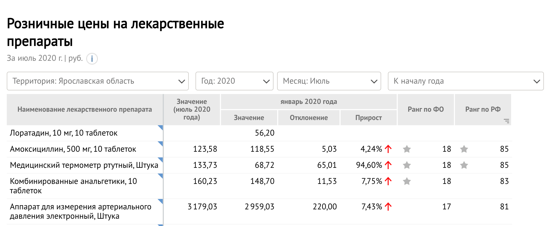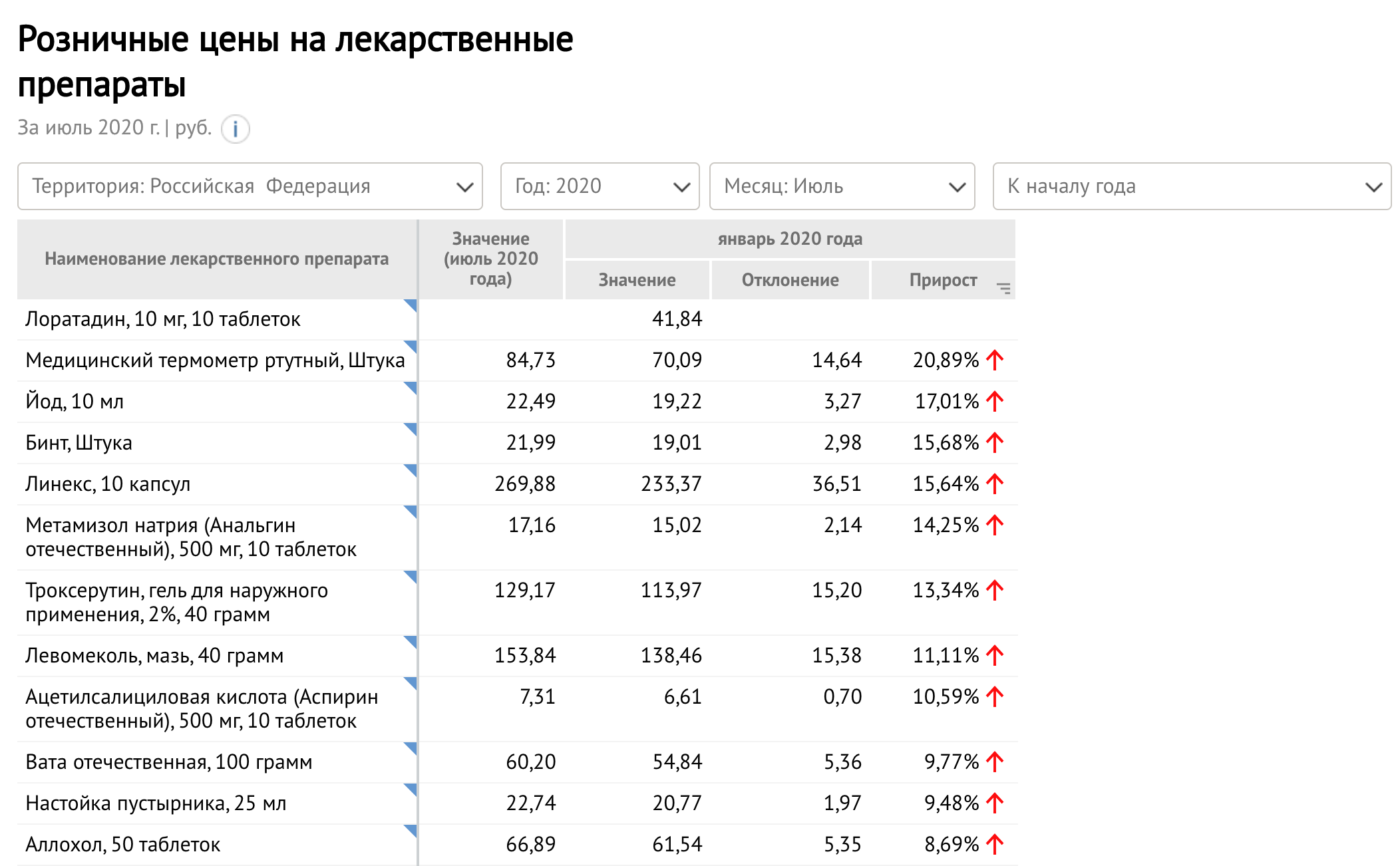 В IМониторинг доступна информация по розничным ценам на лекарственные препараты на 1 августа 2020 года. Наибольшим образом к началу года в среднем по стране подорожали медицинские ртутные термометры. Цена на них с начала года увеличилась на 21% или 14,64 рублей и составила 84,73 рубля.