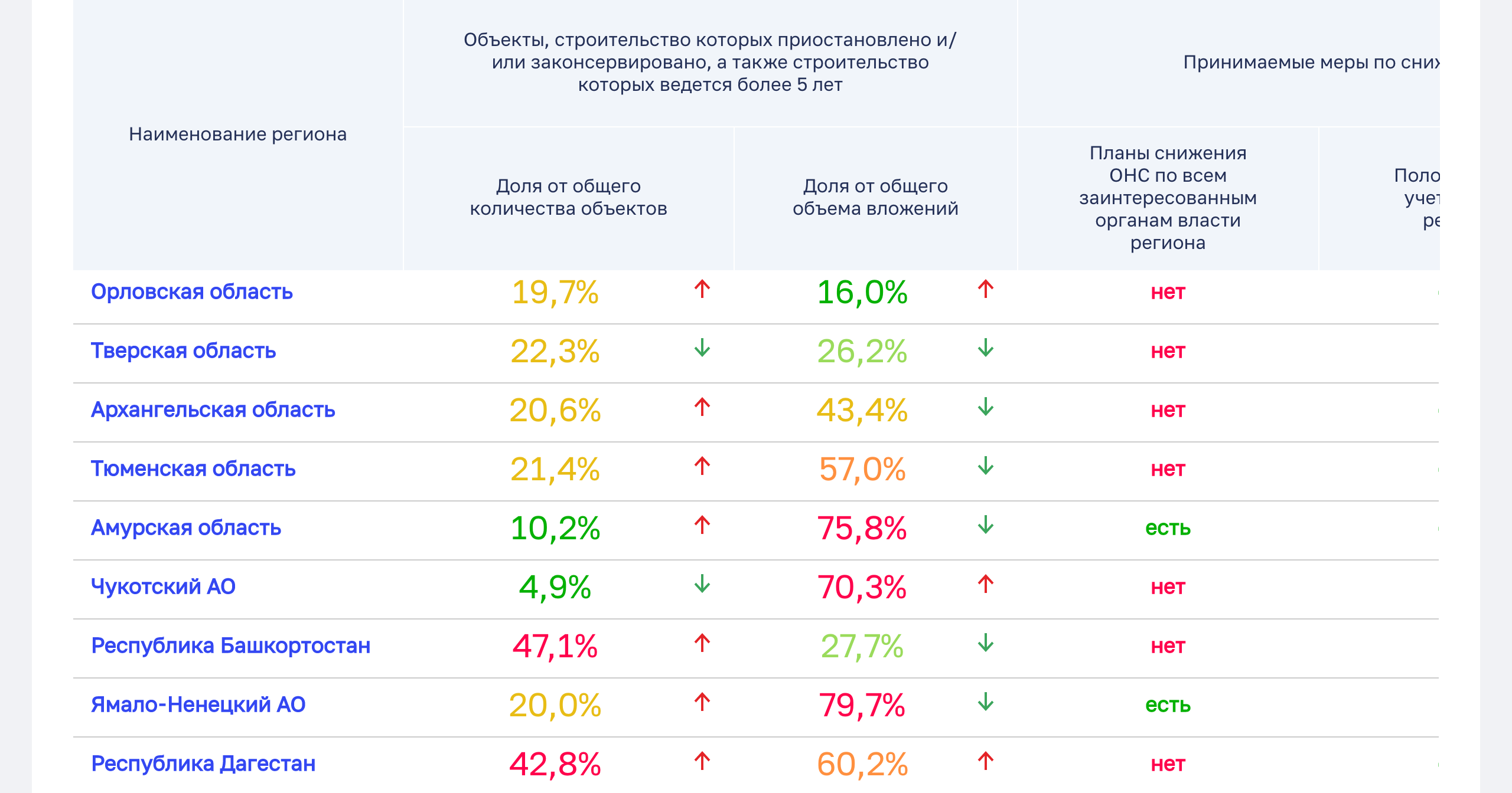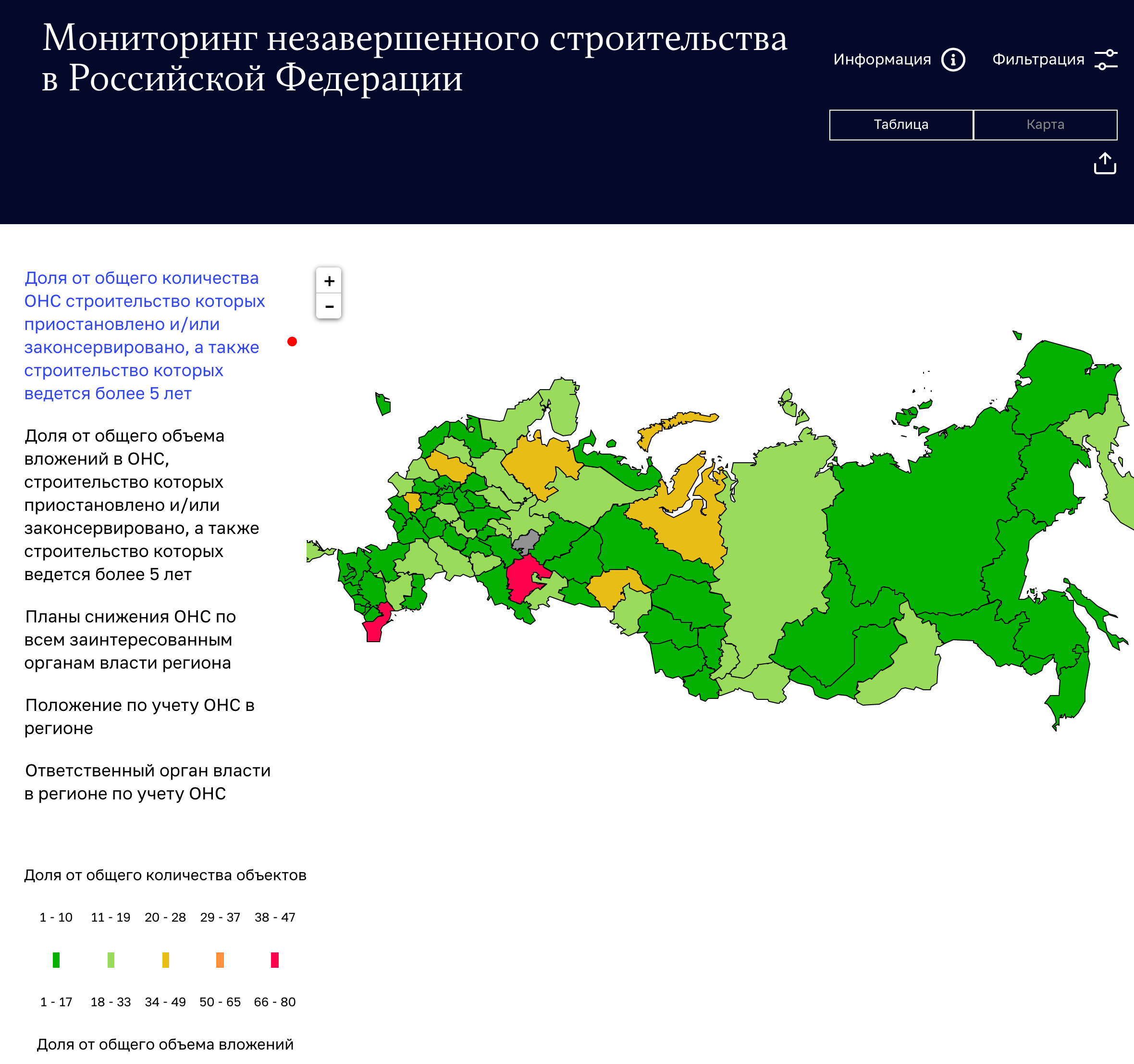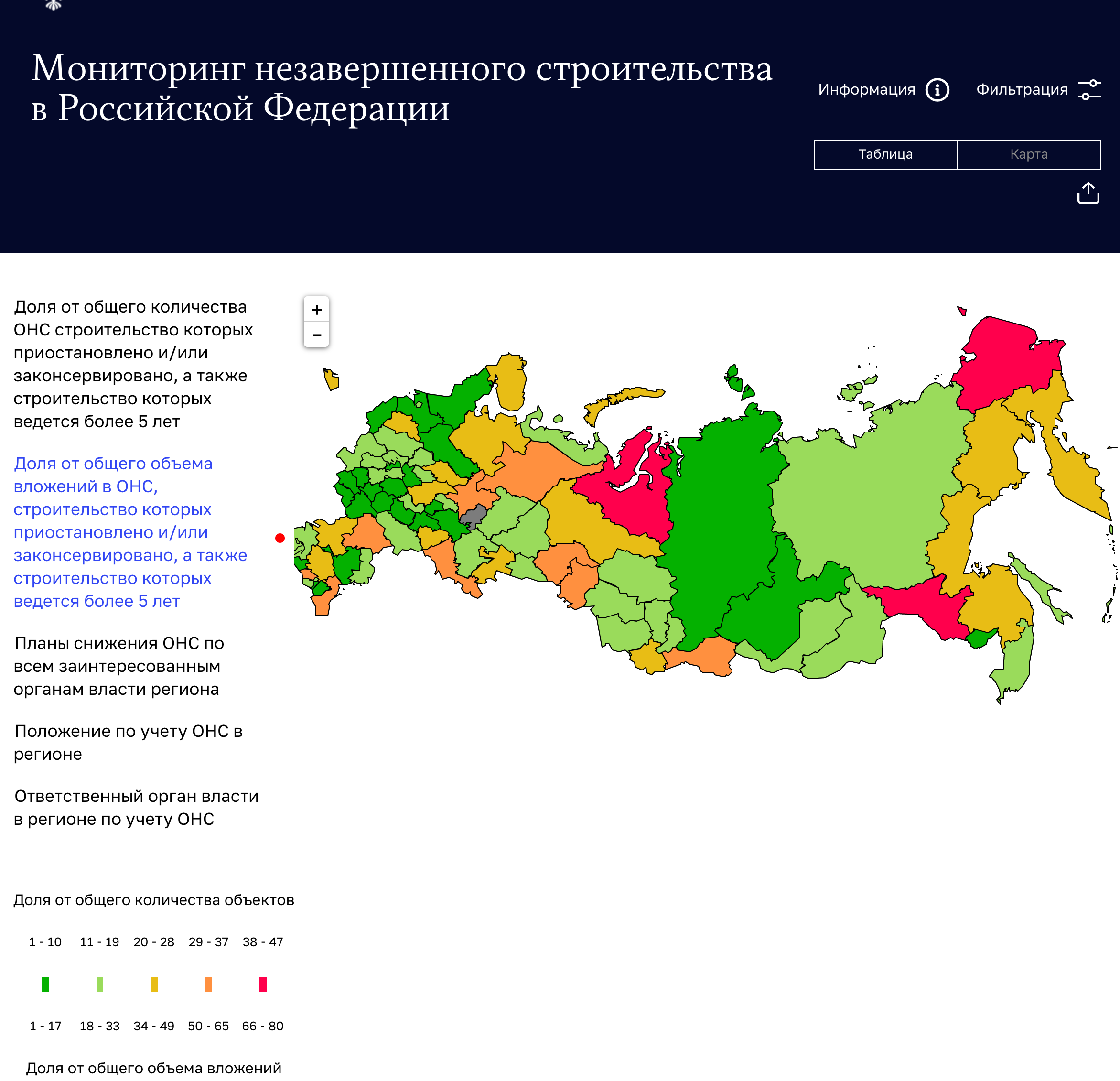 Информационная панель мониторинга незавершенного строительства на официальном сайте Счетной Палаты РФ, основанная на бюджетной отчетности органов исполнительной власти, позволяет провести сравнение российских регионов по доле проблемных объектов в сфере строительства.