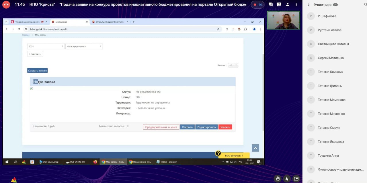 17 января 2025 года специалистами ООО «НПО «Криста» был проведен обучающий вебинар «Подача заявки на конкурс проектов инициативного бюджетирования на портале Открытый бюджет Республики Крым в 2025 году» для представителей городских и сельских поселений.